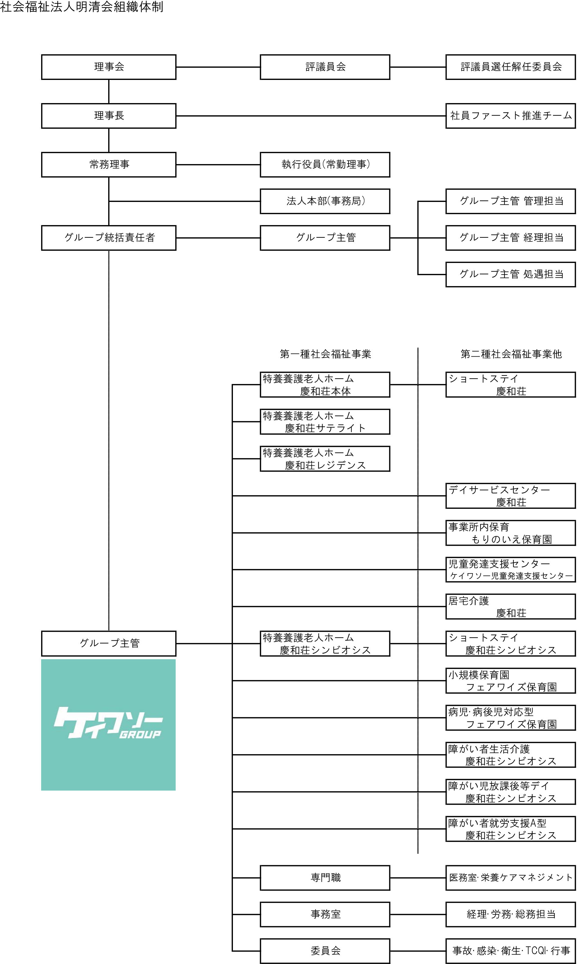 「ケイワソーグループ」は、社会・地域における福祉の発展と充実を使命として、社会福祉事業の安定的・継続的経営に努めるとともに、多様化する福祉事業の課題に、柔軟かつ主体的に参画し、存在意義を明確にする努力を惜しまぬよう取り組みます。また、社会的ルールの遵守を徹底し、公正かつ適正な経営を可能にする実効性のある組織体制を構築します。